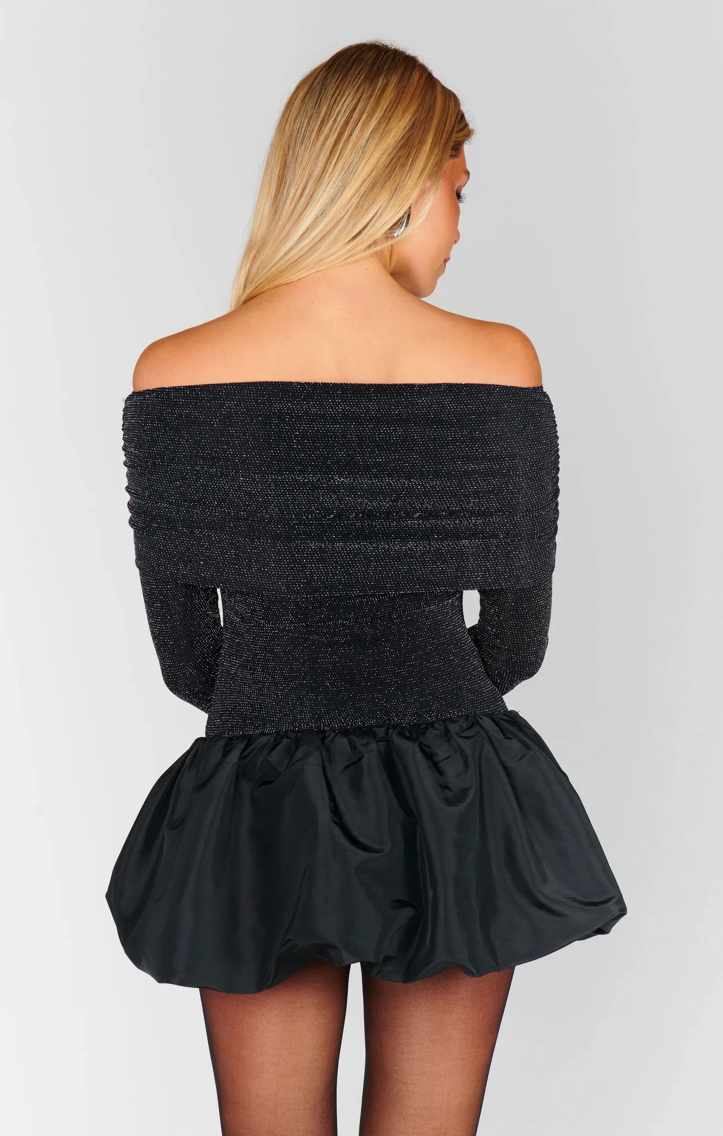 The Charlize Mini is a shiny off-shoulder dress with a curve-hugging fit and a bubbly, party-perfect hem that’s sure to turn heads. Plus, the hidden built-in shorts keep you dancing all night without a worry!