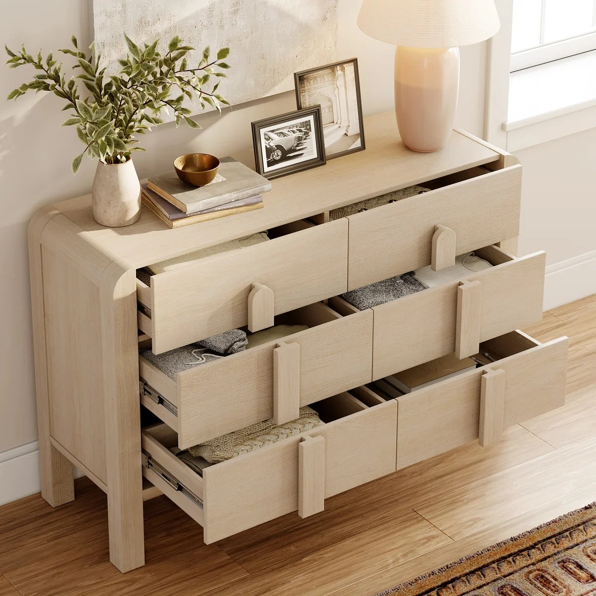 Elevate your child’s storage with the charming 6-Drawer Kids’ Dresser. Its soft finish on painted MDF and solid wood legs complements any children’s room decor. Easy-to-grasp wooden pulls and a playful design add fun sophistication. Spacious drawers store toys and clothes, while the water-resistant, scratch-proof surface ensures durability.